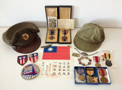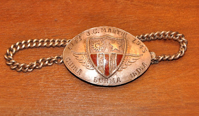 Grupo de medalhas e lembranças do Sgt John C Martin, um tripulante de C47 que cumpriu mais de 1.500 horas de voo em combate no teatro de operações "CBI" (China-Burma-India) desenvolvendo entrega de armamentos, munição, alimentos e soldados atravessando as perigosas cadeias de montanhas e enfrentando ventos fortíssimos do Himalaia em missões em território ocupado pelos japoneses.
