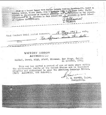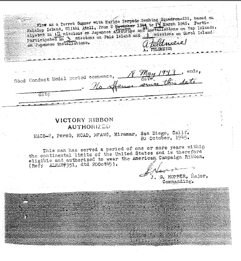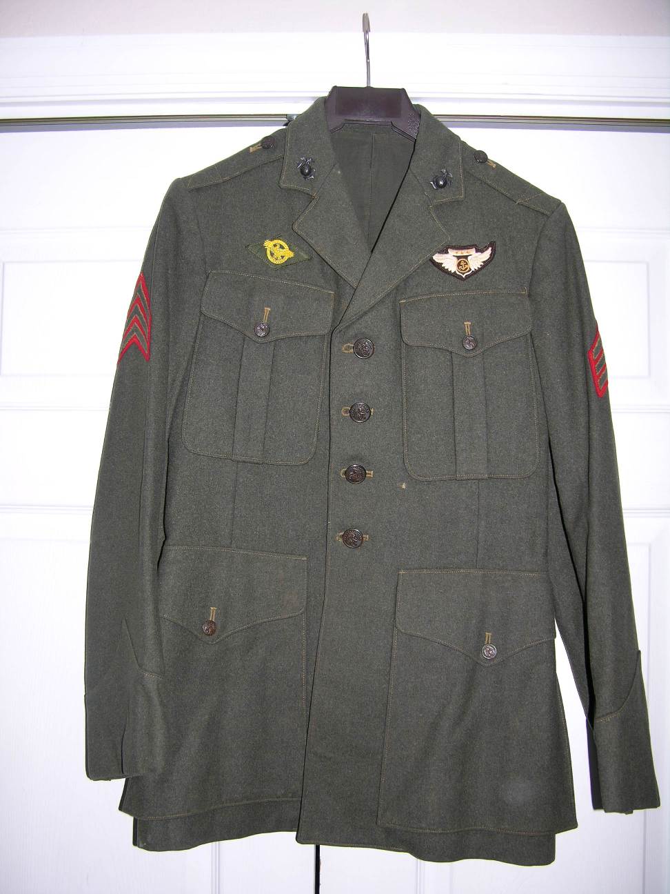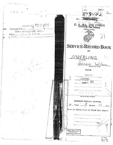 Conjunto de uniforme e documentos do veterano do Corpo Aéreo dos Fuzileiros Navais Americanos, Sgt Francis Wilson Soderling, TBF gunner/navigator do VMFA-232 no Pacífico Sul durante a Segunda Guerra Mundial. O breve de tripulante naval em tecido é raro e foi feito na Austrália: