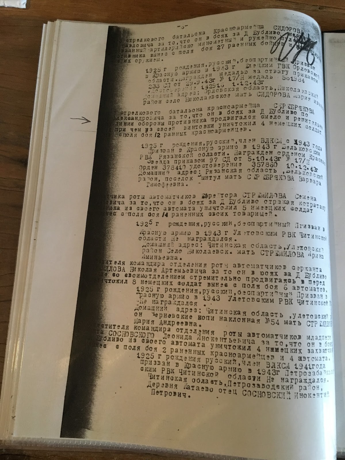 Recebeu por bravura a Ordem da Estrela Vermelha na batalha de 15-25 de setembro de 1943: